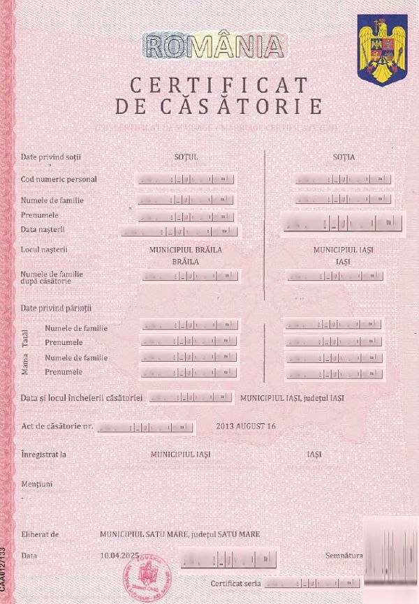 Certificatul de căsătorie este un document eliberat de serviciul de stare civilă, care atestă încheierea căsătoriei între două persoane. Acesta conține detalii despre data și locul căsătoriei, precum și despre parteneri. Este necesar pentru diverse proceduri legale și administrative.